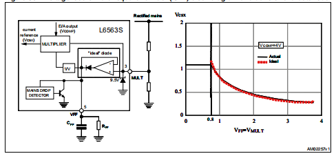电压前馈输入(即乘法器的输出)的动态特性是有限的以0.8 V的电压向下(见图36),因此如果VFF引脚低于0.8 V。这有助于在线路电压为低于最小规定值。