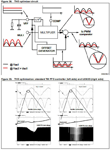 L6563S配备有一个特殊电路,可减小传导死角在线路电压的零交叉点附近发生交流输入电流(交叉变形)。这样,电流的THD(总谐波失真)相当大减少。造成这种失真的一个主要原因是系统无法有效地传递能量当瞬时线电压很低时。这种效应被放置在桥式整流器后面的高频滤波电容器放大,它保留了一些残余导致桥式整流器二极管反向偏压和输入的电压电流暂时停止。为了克服这个问题,该装置迫使PFC预调节器处理更多的能量在线路电压过零点附近,与控制回路的指令相比。这将使能量传递不足的时间间隔最小化,并且将高频滤波电容器放电桥后。图38显示了THD优化器电路的内部框图。