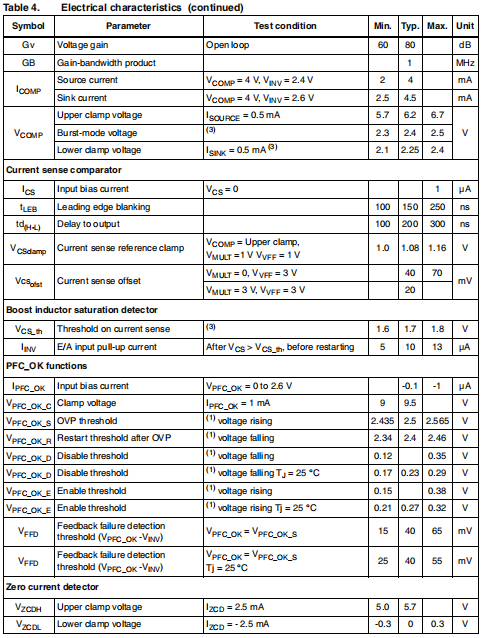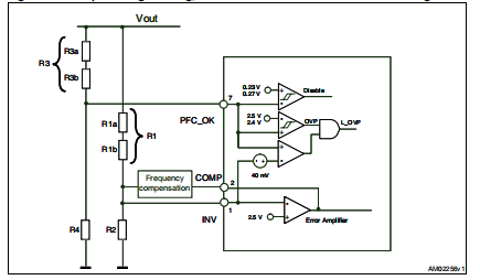 通常,电压控制回路保持PFC预调节器的输出电压Vo接近其标称值,由输出分配器的电阻器R1和R2的比值设置。A该装置的引脚(PFC_OK)被专门用来监测输出电压分离电阻分压器(R3高,R4低,见图35)。选择此分隔符是为了通常,如果输出电压超过预设值,则针脚处的电压将达到2.5 V大于预期的最大Vo。示例:VO=400V,VOX=434V,选择:R3=8.8MΩ;则:R4=8.8MΩ·2.5/(434-2.5)=51千欧。当触发此功能时,闸门驱动活动立即停止,直到引脚PFC_OK上的电压降至2.4 V以下。请注意,R1、R2、R3和R4可以没有任何约束的选择。唯一的标准是两个分隔器都必须下沉来自输出总线的电流需要显著高于INV和PFC U OK引脚。