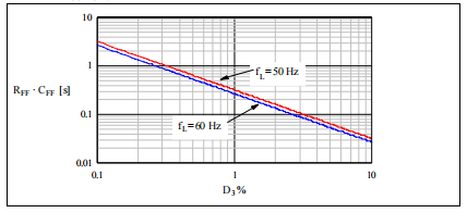 图37显示了一个图表,它可以帮助选择基于最大期望三次谐波失真量。始终将RFF和CFF连接到如果引脚保持浮动或直接连接到,则IC将无法正常工作接地。