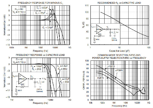 OPA356输出级能够驱动标准的后端接75Ω视频电缆。通过反向端接传输线,它不会向驱动器显示电容性负载。正确的后端接75Ω电缆不会显示为电容;它只向OPA356输出提供150Ω的电阻负载。
