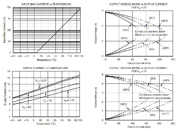 注:不建议运行超过±60 mA的连续直流电流。参见本数据表典型特性部分的“输出电压摆幅与输出电流”图。