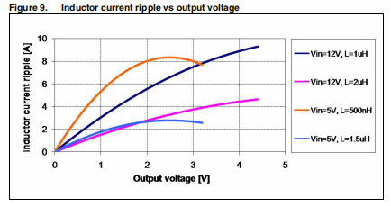 其中FSW是开关频率,VIN是输入电压,VOUT是输出电压。图9显示了不同值的纹波电流与输出电压的关系电感器,VIN=5V,VIN=12V。增加电感值可以减少电流纹波,但同时,增加变频器对动态负载变化的响应时间。响应时间是电感器将电流从初始值更改为最终值所需的时间。直到感应器充电时间尚未结束,输出电流由输出电容器提供。最小化响应时间可以最小化所需的输出电容。如果补偿网络设计良好,在负载变化期间,装置能够设置占空比值与稳态值相差很大(0%或80%)。在这种情况下电流变化所需的时间由感应器所需的时间决定。