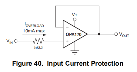 这些ESD保护二极管还提供电路内输入过驱动保护,只要电流限制在10毫安,如绝对最大额定值所述。图40显示了如何在驱动输入端添加一个串联输入电阻来限制输入电流。在其应用中,应使热敏电阻的输入噪声保持在最小值。
