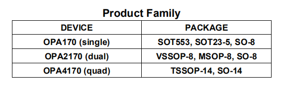 OPA170有SOT553、SOT23-5和SO-8包。双OPA2170有VSSOP-8、MSOP-8和SO-8软件包。quad OPA4170采用TSSOP-14和SO-14包装。OPAx170运算放大器的规定温度为-40°C至+125°C。