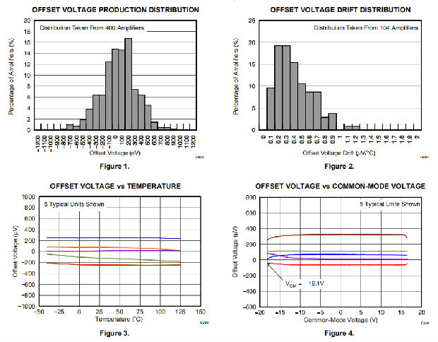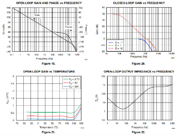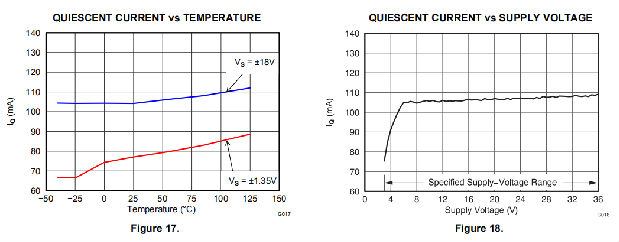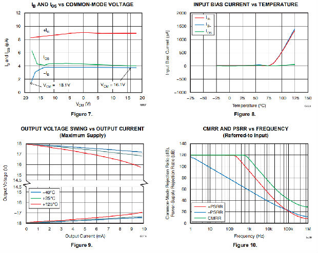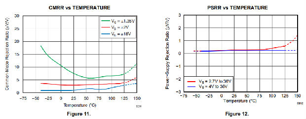 OPAx170系列放大器的工作电压为2.7V至36V(±1.35V至±18V)。许多规范适用于-40°C至+125°C。典型特性中给出了与工作电压或温度相关的显著变化的参数。