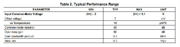 OPAx170系列的输入共模电压范围延伸至负轨以下100mV,正常运行时在正极轨2V范围内。
