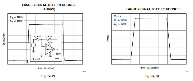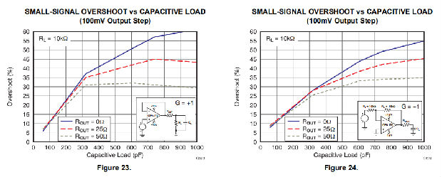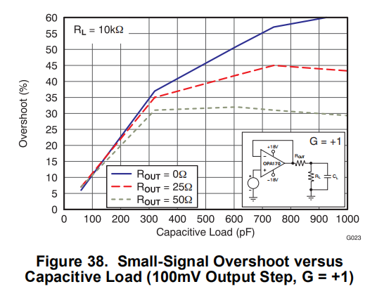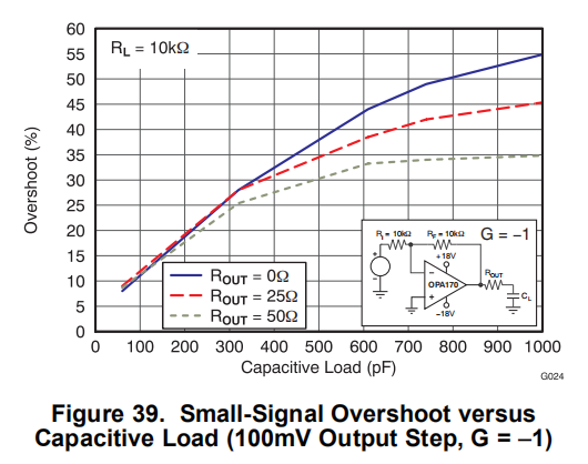 OPAx170的动态特性已针对常见操作条件进行了优化。低闭环增益和高容性负载的结合降低了放大器的相位裕度,并可能导致增益峰值或振荡。如因此,较重的电容性负载必须与输出隔离。实现这种隔离的最简单方法是在输出端串联一个小电阻(例如,ROUT等于50Ω)。图38和图39所示为小信号超调与电容性负载的关系图溃败。还有,有关分析技术和应用电路的详细信息,请参阅应用公告AB-028,反馈图定义运算放大器交流性能(可从TI网站下载)。
