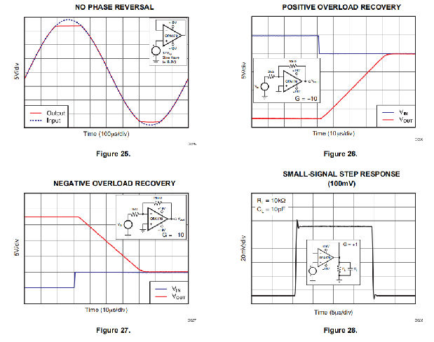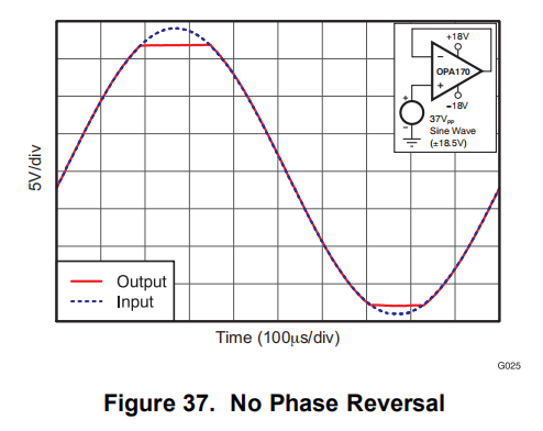 OPAx170系列具有内部相位反转保护。当输入被驱动超过其线性共模范围时,许多运算放大器都会出现相位反转。这种情况在非换向电路中最常见,当输入被驱动到超过规定的共模电压范围时,导致输出反向进入相反的轨道。OPAx170的输入防止过多共模的相位反转电压。相反,将输出限制输入相应的轨道。这种性能如图37所示。