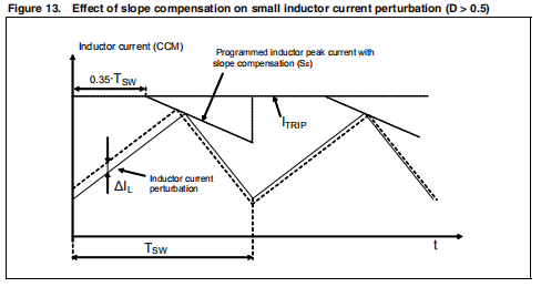 恒频率、峰值电流模式的拓扑结构具有很容易实现环路的优点补偿输出陶瓷盖(降低成本和应用规模)和快速瞬态响应。此外,本征峰值电流测量简化了电流限制保护,避免不希望的饱和电感器。另一方面,这种拓扑结构有一个缺点:存在固有的开环不稳定性当占空比大于0.5时。这种现象被称为“次谐波不稳定性”,可以通过在即将到来的斜坡上添加外部斜坡来避免从感应到的电流。这种基于附加斜坡的补偿技术是称为“坡度补偿”。在图13中,开关占空比高于0.5时,小扰动ÄIL在随后的循环中消失,这是由于斜率的缘故补偿和系统恢复到稳定状态。