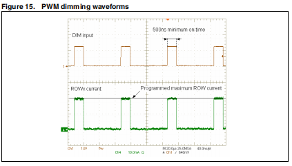 PWM调光的实际限制是可管理的最小接通时间电流发生器,最小接通时间约为500纳秒。因此,最小调光占空比取决于根据