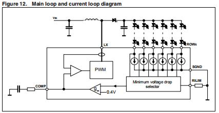 LED6可驱动多行LED(每行可驱动6行)LED串联(最大40 V),最大电流可达30 mA,允许管理不同种类的LED。LED电流可以通过在RILIM之间连接一个外部电阻器(RRILIM)来设置引脚和接地。RILIM引脚上的电压在内部设置为1.23 V根据以下等式,电流与RILIM电流成比例: