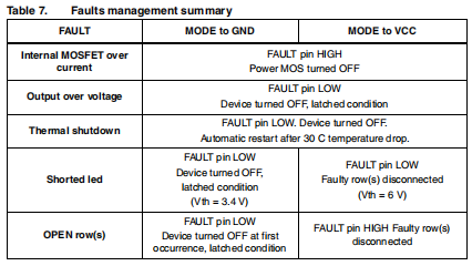 模式引脚是一个数字输入,可以连接到AVCC或SGND以便选择期望的故障检测和管理。LED7706可以处理故障情况根据应用程序的需要,有两种不同的方式。表7总结了装置检测并处理与升压段(过电流、过热和过压)和电流发生器部分(开路)相关的内部保护装置以及LED短路)。