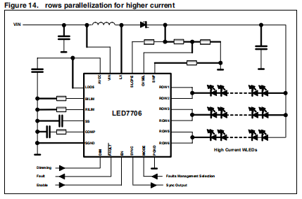 行之间的最大电流不匹配为±2%@Irowx=20 mA。由于LED正向电压的扩散,LED串上的总压降将与众不同。设备将根据模式管脚管理未连接的行设置(见表7)。如果应用程序所需的行数不同,则LED7706允许并行化。如果单排(30毫安)提供的最大电流对两个或两个以上的负载是不够的电流发生器可以连接在一起,如图14所示。连接行之间的并行操作必须尽可能靠近设备,以便减小寄生电感。