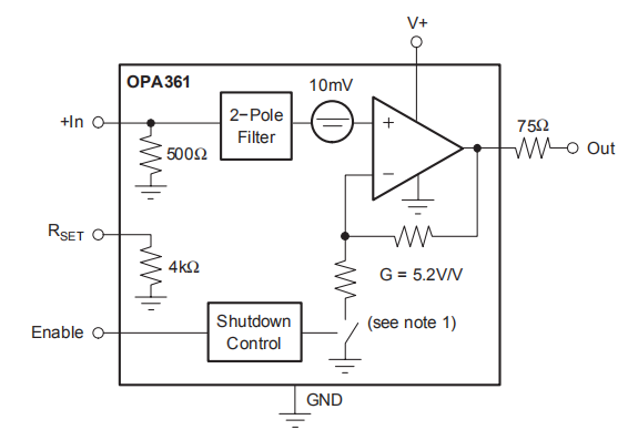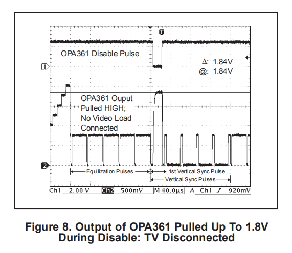 禁用OPA361时,内部电路也会断开内部增益设置反馈。此功能支持电视检测功能。有关更多详细信息,请参阅电视检测功能部分。