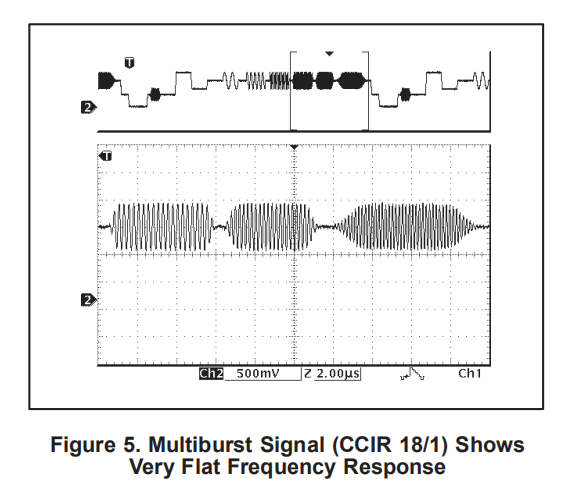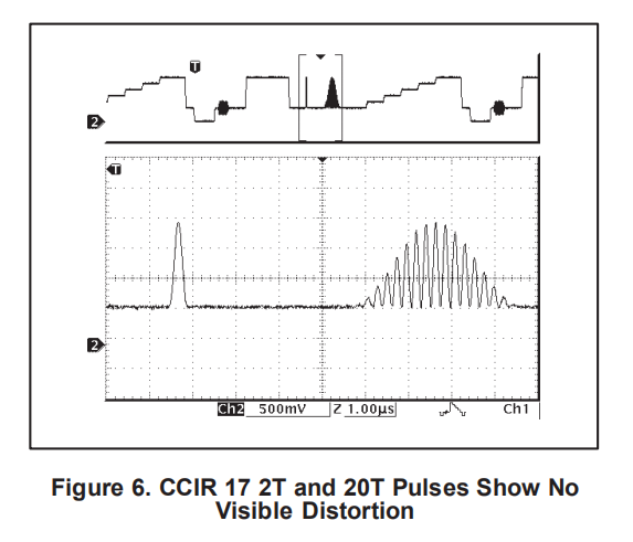 CCIR17测试模式包含2T和20T脉冲,如图6所示。2T脉冲用于检查脉冲失真和反射,20T脉冲用于检查色度和亮度之间的振幅和群延迟。两个脉冲都没有显示任何失真或群延迟伪影。