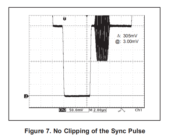 图7显示了OPA361的真实输出摆动能力,它将输入同步脉冲的尖端置于略负的电压。即使输出同步尖端为3mV,75Ω系列终止后的输出仍不显示同步脉冲的削波。