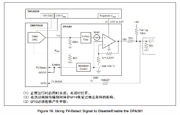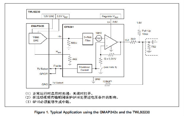 OPA361高速放大器是为3V便携式视频应用而优化的。它是专门设计来兼容视频编码器嵌入德州仪器的OMAP2420和达芬奇处理器或其他具有0.5VPP视频输出的应用处理器。输入共模范围包括GND,它允许视频DAC(数模转换器)直流耦合到OPA361。电视检测功能通过促进视频传输的自动启动/停止,大大简化了最终用户界面。
