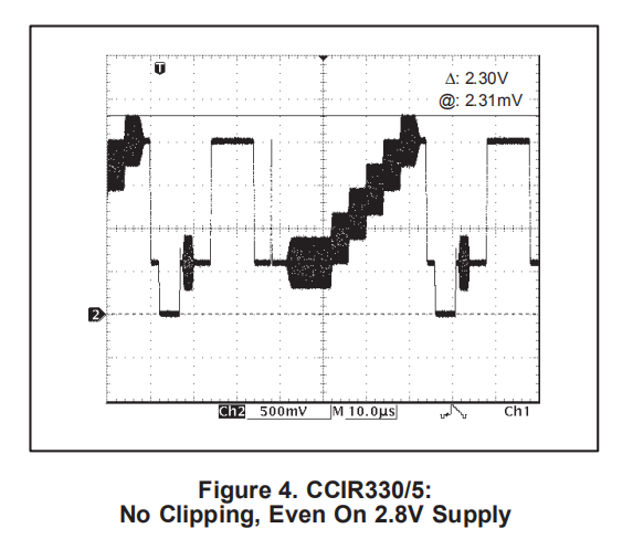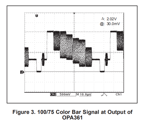 CCIR330/5测试模式需要最大的动态范围之一,因此测试OPA361输出电压摆动能力。图4所示的范围图是用2.8V电源拍摄的,并且在信号的顶部没有显示任何剪切。
