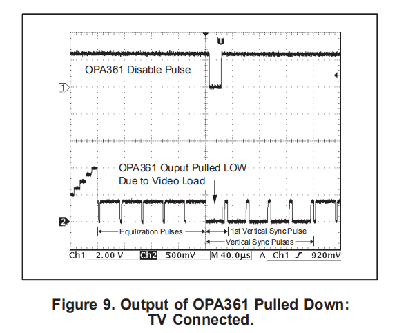 OPA361的电视检测功能与OMAP242x(或其他处理器)配合工作,以检测电视是否连接到设备的视频输出。为了检测电视负载,OPA361会短暂关闭,理想情况下是在第一个垂直同步脉冲期间。对于检测,在OPA361的输出端使用一个连接到处理器逻辑电源的简单上拉电阻器。如果连接了电视(或其他视频设备),电压电平会被拉低;如果没有连接,电压电平会被拉高。处理器中的GPIO可用于读取此逻辑电平,并决定是否连接了视频负载。图8显示了TV断开时的范围图,图9显示了连接TV时的范围图;两个图中的上线是禁用脉冲。图10显示了使用电视检测信号来禁用或启用OPA361。