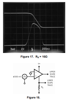 LMC7215在2.7V电源和1.8mA电源条件下,在约400ns的时间内产生300μa峰值的小电流尖峰峰值为400ns,5V电源。只有当输出从高到低时才会出现峰值。它没有从低到高发生。图16和图17显示了在2.7V和5V电源。上轨迹是输出电压,下轨迹是用测量的电源电流图18中的电路。如果电源具有很高的阻抗,0.01μF的旁路电容器应足以尽量减少这个小电流脉冲的影响。