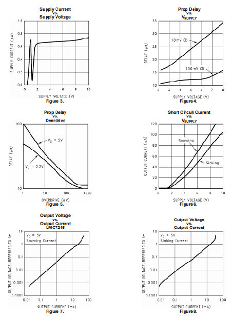 即使这些比较器使用小于1μA的电源电流,输出也能够驱动非常大的电流电流。当在5V电源上工作时,LMC7215可提供高达50 mA的电源。LMC7215和LMC7225都可以下沉超过20毫安。(请参阅“典型特性”部分中的最大IO与V电源的关系图。)这种大电流处理能力允许直接驱动重载。LED、蜂鸣器和其他负载可以轻松驾驶。LMC7215的推挽输出级是一个非常重要的特性。这样可以保持系统的总功率消耗量降至绝对最低。唯一消耗的电流是小于1μA的电源电流和电流直接进入负载。当输出较低时,上拉电阻器不会浪费功率。这个LMC7225仅在需要从一个逻辑电平到另一个逻辑电平的电平转换功能的情况下推荐,其中LMC7225被用作老式比较器的低功耗替代品,或用于多个输出将被并行。