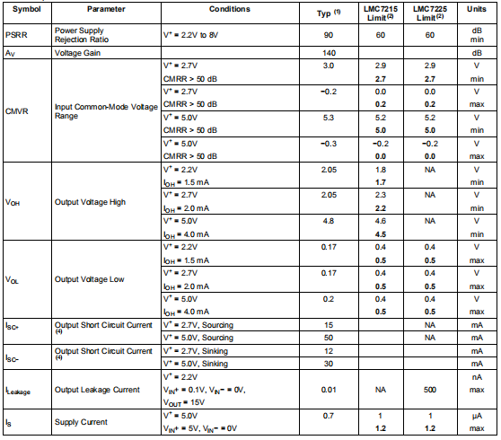 除非另有规定,TJ=25°C、V+=2.7V至5V、V负极=0V、VCM=VO=V的所有限制+/2。黑体限制适用在极端温度下