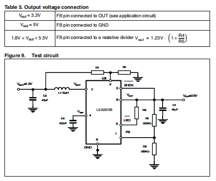 必须选择作用于FB引脚的输出电压。有三种选择:固定3.3V,5V或通过外部电阻可调的输出设置分隔线。