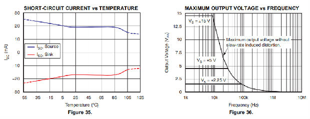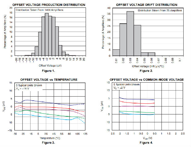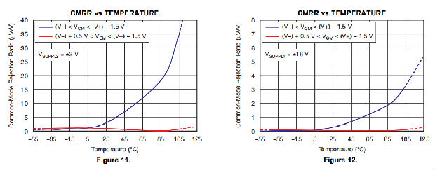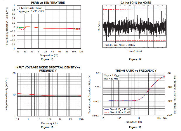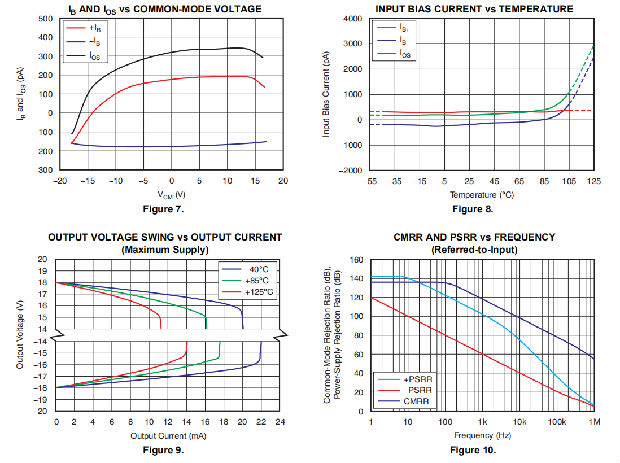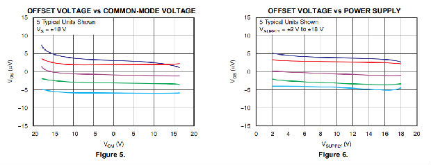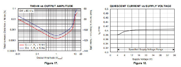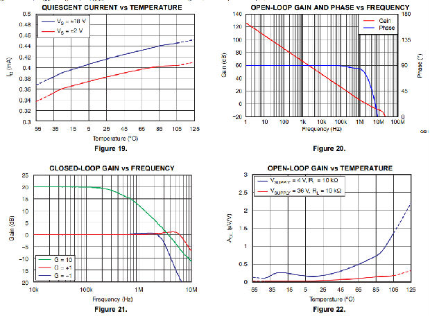 OPA2188规定工作电压为4伏至36伏(±2伏至±18伏)。许多规范适用于-40°C至+105°C。典型特性中给出了与工作电压或温度相关的显著变化的参数。