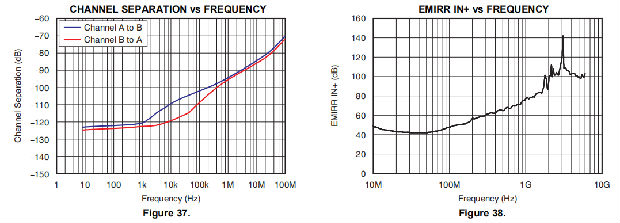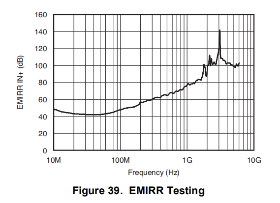 OPA2188使用集成电磁干扰(EMI)滤波来减少来自无线通信和人口稠密的板(带有模拟信号链和数字组件)的EMI干扰的影响。EMI抗扰度可以通过电路设计技术提高;OPAx188从这些设计改进中受益。德州仪器公司已经开发出能够准确测量和量化运算放大器在从10兆赫到6兆赫的宽频带上的抗扰度。图39显示了在OPA2188上的测试结果。详细信息也可以在应用报告中找到,运算放大器的EMI抑制比(SBOA128),可从TI网站下载。