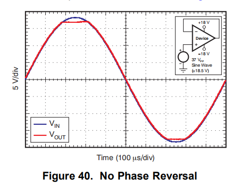 OPA2188具有内部相位反转保护。当输入被驱动超过其线性共模范围时,许多运算放大器都会出现相位反转。这种情况在非换向电路中最常见,当输入被驱动到超过规定的共模电压范围时,导致输出反向进入相反的轨道。OPA2188输入可防止共模电压过高时的相位反转。相反,输出限制在适当的轨道上。这种性能如图40所示。