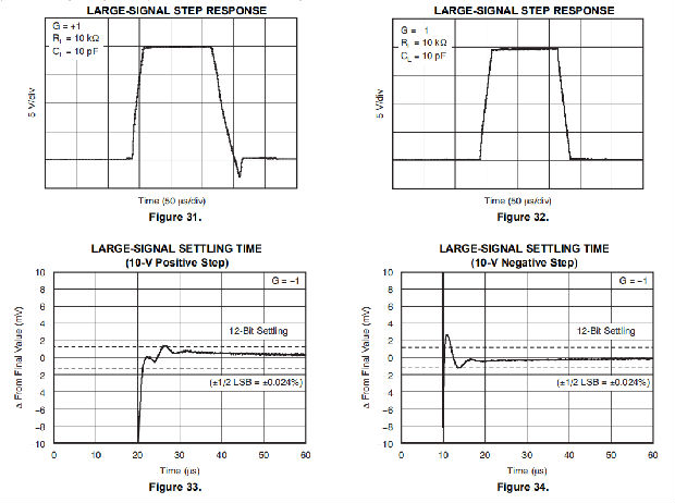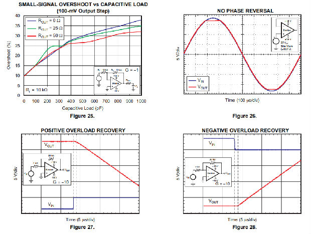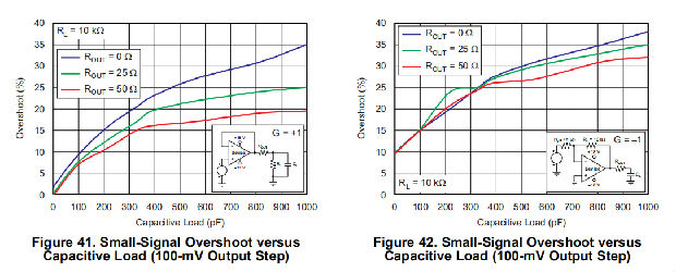OPA2188的动态特性已针对一系列常见操作条件进行了优化。低闭环增益和高容性负载的结合降低了放大器的相位裕度,并可能导致增益峰值或振荡。因此,较重的电容性负载必须与输出隔离。实现这种隔离的最简单方法是在输出端串联一个小电阻(例如,ROUT等于50Ω)。图41和图42示出了几个ROUT值的小信号超调与电容性负载的关系图。此外,有关分析技术和应用电路的详细信息,请参阅应用报告,反馈图DefineoPapc Performance(SBOA015),可从TI网站下载。