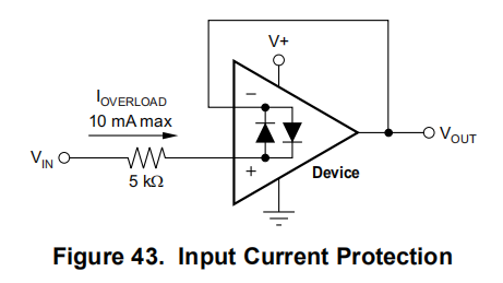 这些ESD保护二极管还提供电路内输入过驱动保护,只要电流限制在10毫安,如绝对最大额定值所述。图43显示了如何在驱动输入端添加一个串联输入电阻来限制输入电流。增加的电阻在放大器输入端产生热噪声,在对噪声敏感的应用中,其值应保持在最小值。