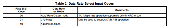 串行数据速率选择器(速率[1:0])允许用户固定操作串行数据速率。别针有保持逻辑低输入状态的内部下拉菜单,除非外部驱动到逻辑高状态。此输入还用于将设备置于测试模式。表2中显示的代码选择所需的操作串行数据速率。LMH0046随后进入自动速率检测模式或单个工作速率。在重新锁定DVB-ASI数据时,也可以选择270 Mbps速率模式。DVB-ASI数据为MPEG2以8B10B编码传输的编码数据。该装置将重新锁定该数据,而无需谐波锁定。自动速率检测模式可用于任何支持的数据速率,包括DVB-ASI。