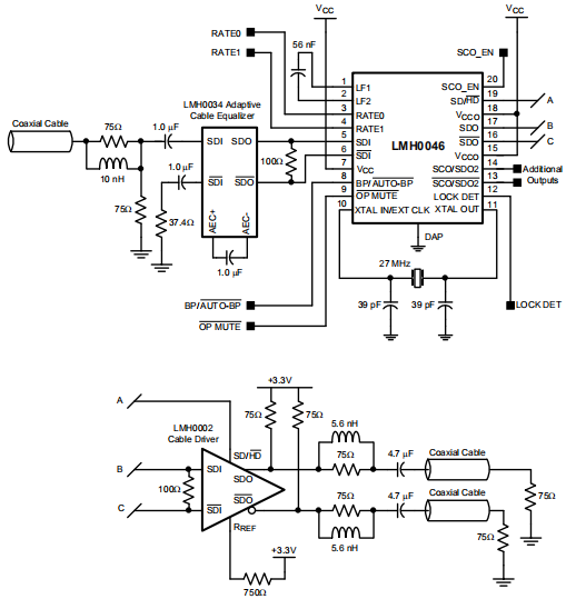 图7显示了LMH0046和LMH0034 SMPTE 292M/259M自适应电路电缆均衡器和LMH0002 SMPTE 292M/259M电缆驱动器。