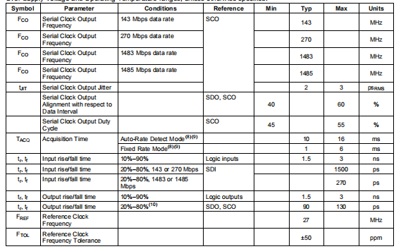 该设备以143 Mbps、270 Mbps、1483 Mbps和1485 Mbps的串行数据速率工作。这个设备可以不能锁定这些速率的谐波。该装置不会锁定并自动进入重合闸旁路以下数据速率的模式:177 Mbps、360 Mbps和540 Mbps。串行数据时钟/串行数据2输出串行数据时钟/串行数据2输出由SCO帴EN输入控制,并提供一秒重定时串行数据输出或适合串行数据速率的低抖动差分时钟输出处理。当作为串行时钟输出运行时,时钟的上升沿将位于数据间隔中心10%内的相应串行数据位间隔。当SCO_EN输入为逻辑低时,差分输出SCO/SDO2用作第二个串行数据输出水平。当SCO_EN输入为逻辑高电平时,该输出用作串行数据速率时钟输出。这个SCO iu EN input有一个内部下拉设备,SCO峎EN的默认状态是low(串行数据输出2已启用)。当静音输入为逻辑低电平时,SCO/SDO2被静音。当旁路模式激活时而这个输出作为一个串行时钟输出,输出也将被静音。