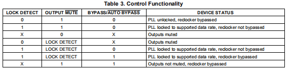 旁路/自动旁路输入高时,强制设备输出数据而不重新锁定。什么时候输入低,当装置处于解锁状态时,装置自动绕过重合闸功能条件或检测到的数据速率是设备不支持的速率。见表3。旁路/自动旁路有一个内部下拉装置。