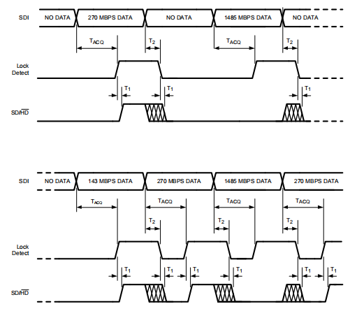 T2=从SDI输入更改到锁定检测取消断言的时间,最长1毫秒。SD/HD输出在此期间无效。