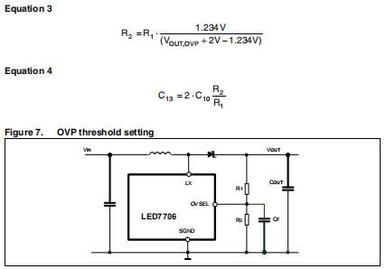 提供可调过电压保护。它可以设置为用输出电压的一个分区。分频器中心抽头的电压为与固定的1.234V阈值相比。当OVSEL引脚上的电压超过OV时阈值,故障引脚被低绑(见第25页第8节),设备关闭;这种情况被锁定,通过切换EN引脚或执行上电复位(当LDO输出低于下限时,发生PORUVLO阈值,随后在上升过程中越过UVLO阈值上限输入电压的相位)。通常,分压器的高压侧电阻值必须选择尽可能高(但低于1 MΩ)以减少输出电容当升压转换器关闭时(在调光周期的关闭阶段)放电。这个R2/R1比率被计算为在输出电压为2v时触发OVP电路高于给定LED串的最大值(见方程式3)。另外两个可能需要滤波电容器C10和C13,以提高OVSEL的噪声抑制能力如图7所示。C10的典型值在100 pF-330 pF范围内,而C13值由方程式4给出。