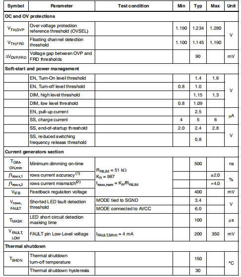 LED7706具有高效率单片升压变换器和六控专门设计用于提供用于背光照明的LED阵列液晶面板。设备可以管理输出电压高达36 V(即每排10个白色LED)。发电机可外部编程为吸收电流高达30毫安,可通过PWM调暗信号(20 kHz时1%调光占空比可以管理)。该设备允许检测和管理LED开路和短路故障,并让未使用的行浮动。基本防护(输出过电压,内部MOSFET过电流和热关机)是提供。