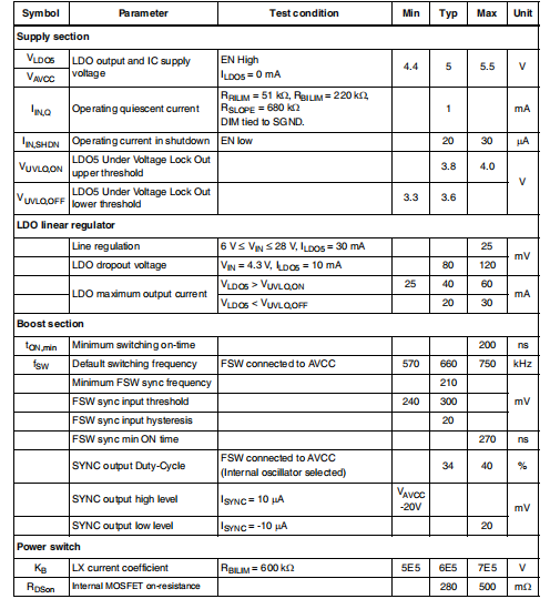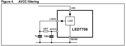 LED7706是用于LCD面板背光的单片LED驱动程序,它包括升压转换器和六个PWM可调光电流发生器。升压部分基于恒定的开关频率,峰值电流模式建筑。控制升压输出电压,使最低行的电压,参考SGND,等于内部参考电压(400 mV典型值)。输入电压范围从4.5伏到输出电压。此外,LED7706还有一个内部LDO它为设备的内部电路供电,并能提供高达40毫安的电流。这个LDO的输入是VIN引脚。LDO5引脚是LDO输出,同时也是功率MOSFET驱动器的电源时间。AVCC引脚是模拟电路的电源,应连接到LDO输出通过一个简单的RC滤波器。