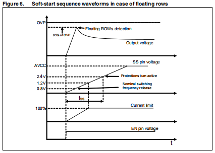 在软启动阶段,还执行浮动行检测。当着一个人的面或浮动列数较多时,误差放大器不平衡,输出电压增大;当达到浮动行检测(FRD)阈值(OVP阈值的95%)时,根据表7管理浮动行(见第25页第8节)。在SS电压达到2.4V阈值,启动结束,所有保护装置转动积极的。软启动电容器CSS可根据式2计算。