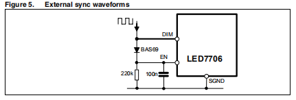 LED7706由EN引脚启用。该引脚在高位激活,当强制SGND时,设备已关闭。该引脚连接到一个永久激活的2.5μa电流源;当需要在通电时突然打开设备,该引脚必须保持浮动或连接到延迟电容器。当关闭时,LED7706快速释放软启动电容器,关闭功率MOSFET,电流发生器和LDO。因此,功耗仅降低到20μA。在使用调光信号打开和关闭设备的应用中,EN引脚如图5所示,可以连接到尺寸销上。