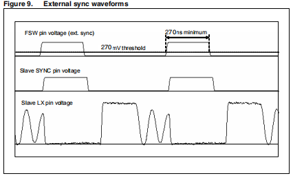 当外部同步时钟应用于FSW引脚时,内部振荡器过驱动:每个开关周期从时钟上升沿开始,而斜率补偿斜坡从同一信号的下降沿开始。因此,外部需要最大占空比为40%的时钟进行同步转换器工作在连续导通模式(CCM)。最小脉冲宽度允许检测到的同步脉冲是270ns。
