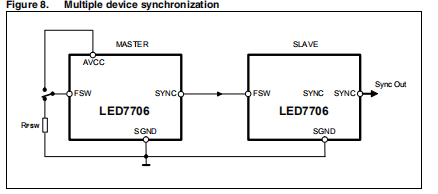 此外,当FSW引脚连接到AVCC时,LED7706使用默认的660 kHz固定开关频率,允许在最小元件计数应用中节省一个电阻。FSW引脚也可以用作同步输入,允许LED7706工作同时作为主设备或从设备。如果最小频率为220 kHz的时钟信号锁定270毫伏(同步到该设备)。内部超时只要外部时钟频率大于220kHz,就允许同步。将FSW引脚电压保持在低于270mv的时间超过6μs会导致设备转动关闭。一旦FSW上升到上述阈值以上,则恢复正常运行重复软起动顺序。同步管脚是同步输出,提供当LED7706用作FSW的主或副本时,35%(典型)占空比时钟当用作从属设备时使用。它用于连接菊花链配置中的多个设备或将系统中运行的其他开关变换器与LED7706同步(主操作)。