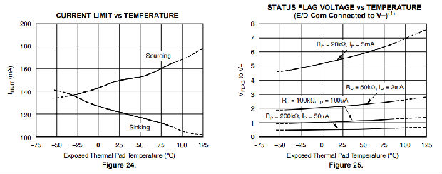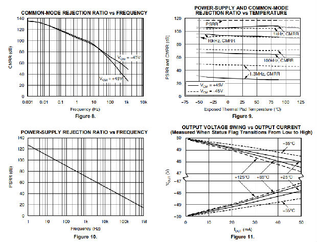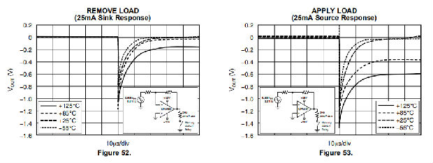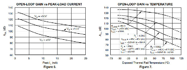 OPA454驱动几毫安的输出电流到50mA以上,同时保持良好的运算放大器性能。在不同的输出电流水平下,开环增益与温度的关系见图7。
