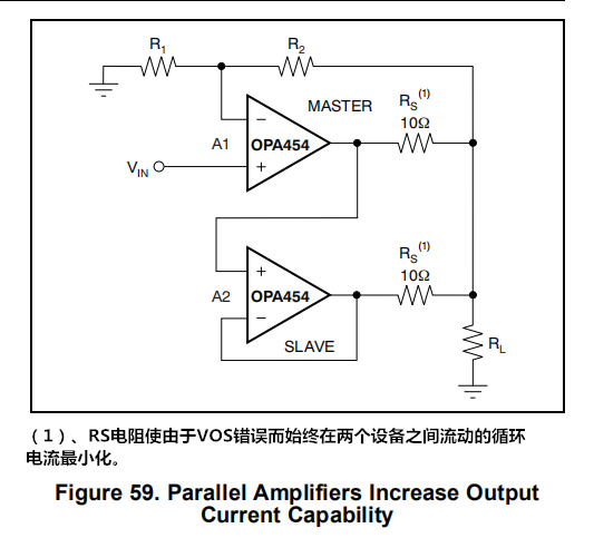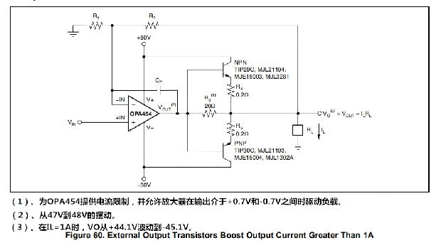 在25mA输出电流不足以驱动所需负载的应用中,可通过并联连接两个或多个OPA454来增加输出电流,如图59所示。放大器A1是主放大器,可以配置在几乎任何运算放大器电路中。从放大器A2被配置为单位增益缓冲器。或者,可以使用外部输出晶体管来提高输出电流。图60中的电路能够提供高达1A的输出电流,晶体管如图所示。