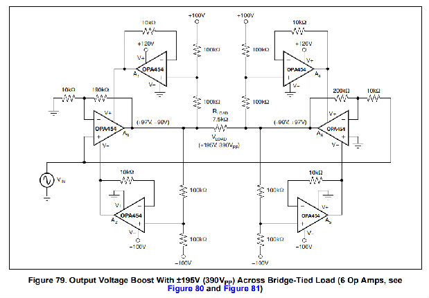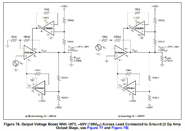 参见图76和图79,分别在三级和六级运放输出级的输出电压升压配置中使用OPA454的电路示例。