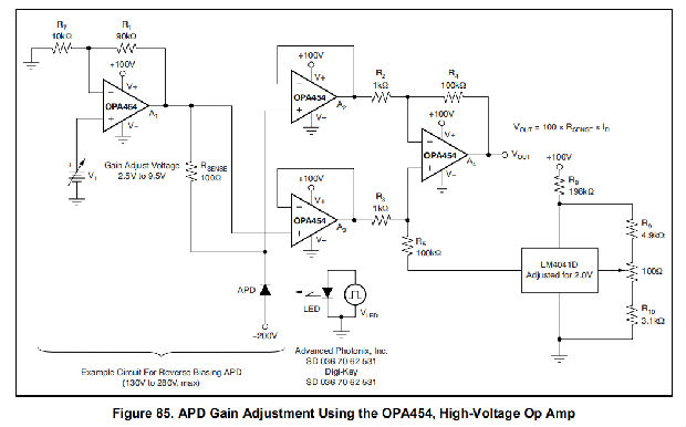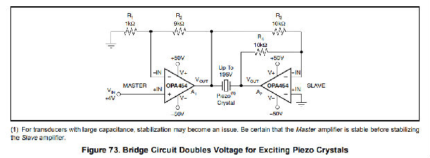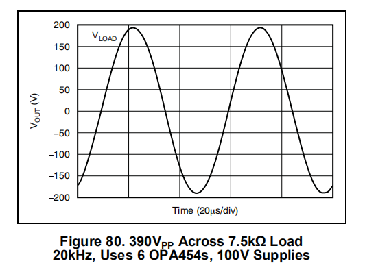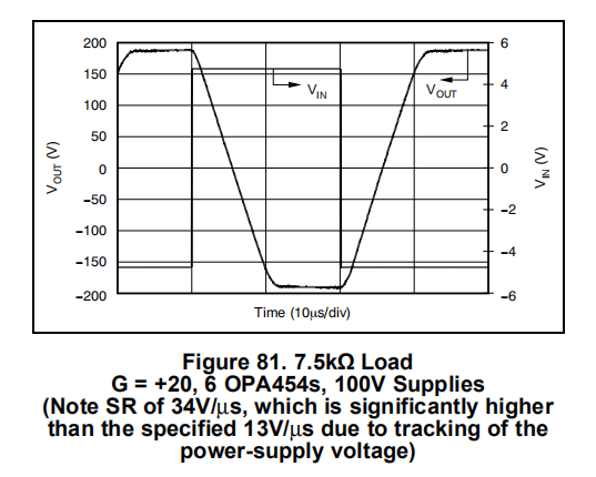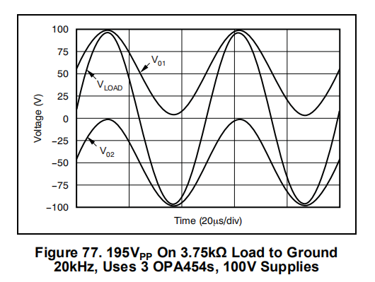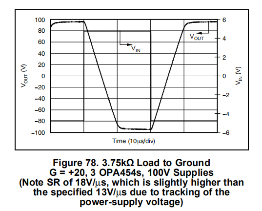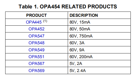 OPA454是一种低成本运算放大器,具有高电压(100V)和相对高电流驱动(25mA)。它具有单位增益稳定,增益带宽积为2.5MHz。