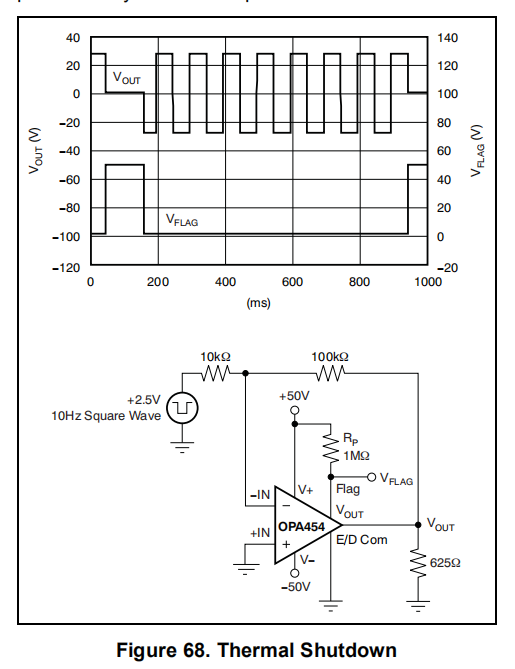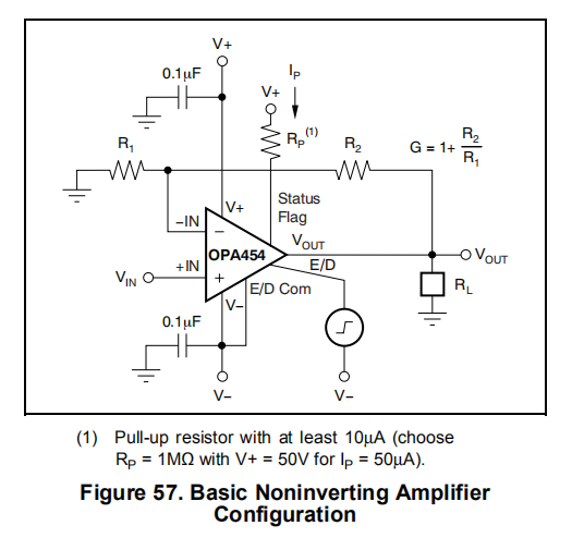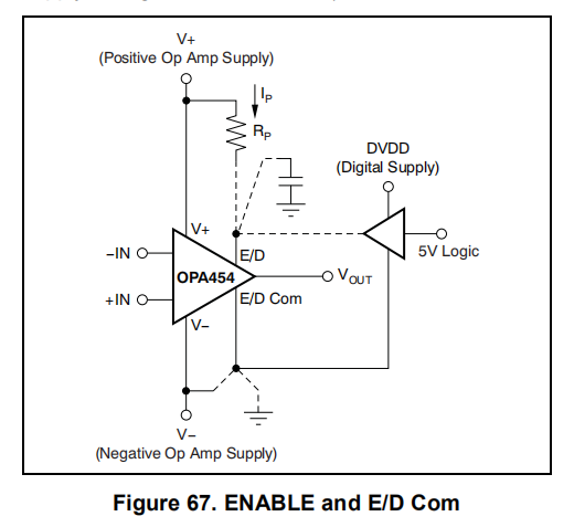 如果保持断开状态,E/D Com被内部10μA电流拉近V–(负电源)来源。什么时候左浮动,启用由内部1μA电源保持在E/D Com上方约2V。即使在启用和E/D Com引脚未连接时,OPA454的主动操作也会产生,电容耦合到启用引脚的中等快速、负向信号可以抑制1μa的上拉电流并导致设备关闭。这种行为可以表现为一种振荡,在接近极端低温时首次出现。如果不使用使能功能,保守的方法是通过30pF电容器将使能连接到低阻抗电源。另一种选择是从V+(正电源)连接一个外部电流源,足以使使能水平保持在停机阈值以上。图67显示了连接ENABLE和E/D的电路Com.选择RP为1MΩ,正电源电压为+50V,IP=50μa。